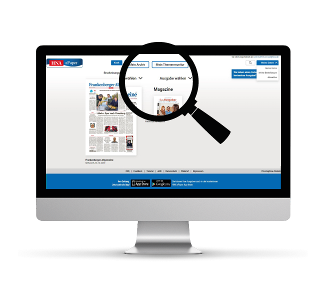 Im angemeldeten Zustand können Sie im Bereich "Meine Daten" Ihre persönlichen Daten einsehen, Ihr Passwort ändern und eine Übersicht Ihrer getätigten ePaper Einkäufe erhalten.